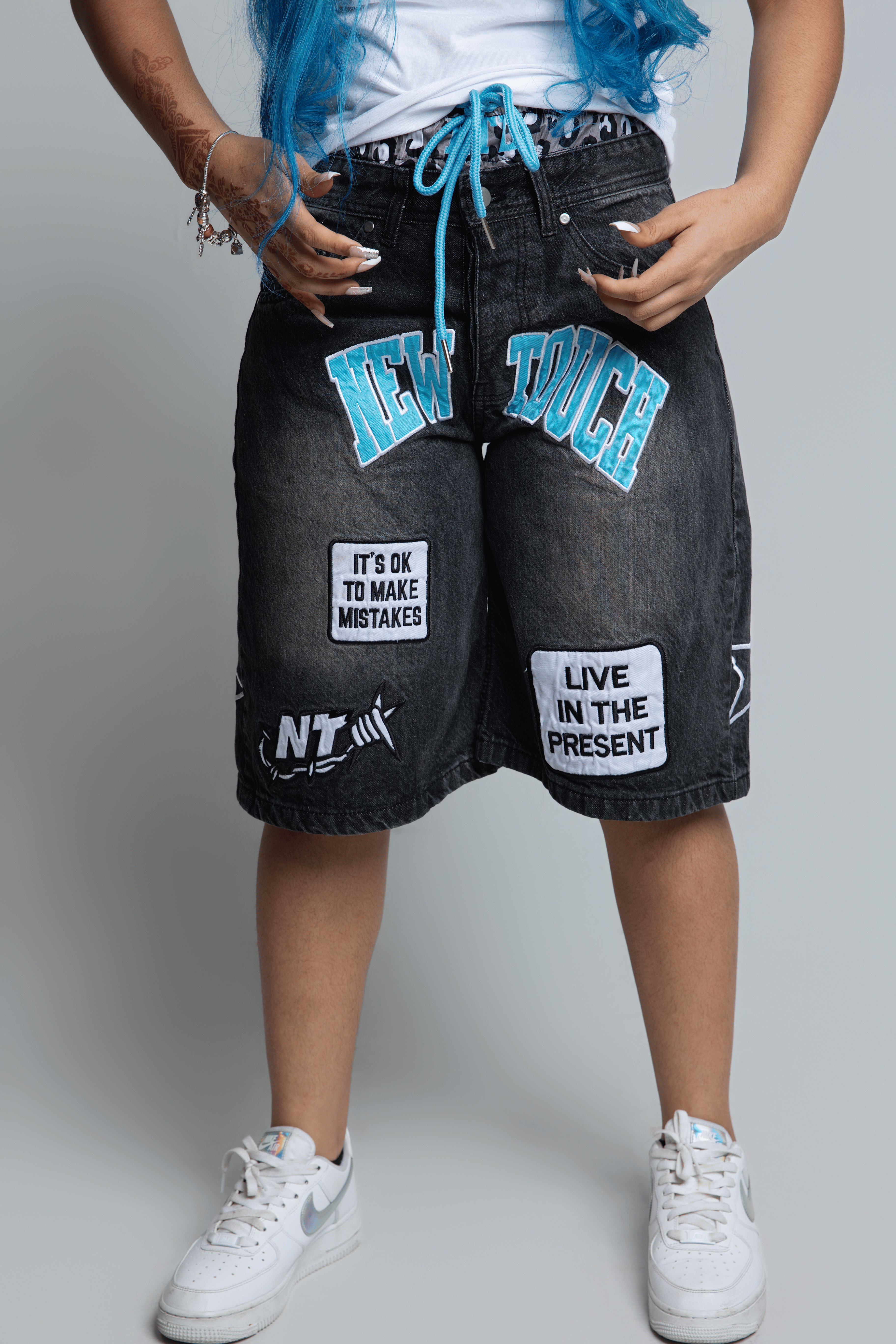 - Inner/stacked waistband: A gray-and-black leopard print band with blue “NTL” lettering—a standout layered detail that adds personality and trendiness.